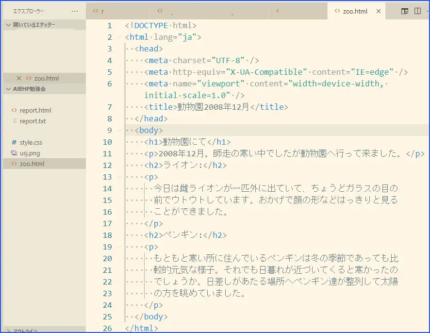 - Visual Studio Codeを起動し、新規作成から下記を入力し「zoo.html」として保存した。