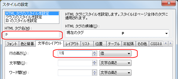- text1.htmlをビルダーで開き、「p」について行の高さを「1.5倍」に設定する。ソースには「p{line-height : 1.5;}」と書き込まれる