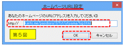 F第5図中段のhttp://の後ろのボックスにホームページのトップページのURLを入力し、「OK」をクリック(http://は欄外にあるので、その後だけを入力。)