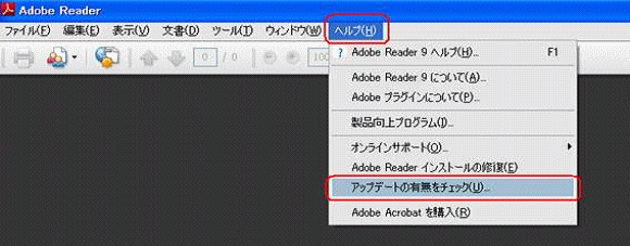 - Adobe Reader を立ち上げたままで、[ヘルプ]→[アップデートの有無をチェック]をクリックし、更新プログラムがあるかどうかをチェックします。