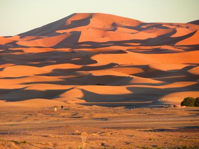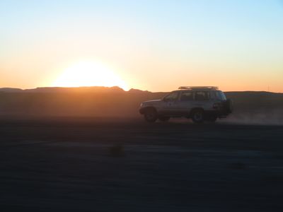 エルフードの町に夕方到着しました。そこで4WDに乗り換えていよいよ砂漠を走ります。しばらく舗装された道路を進むと夕日に染められた砂丘が見えてきました。
