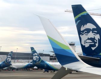 シアトルでは長い時間待ちの間、アラスカ航空機をたくさん見ました。尾翼には大きく顔が描かれています。