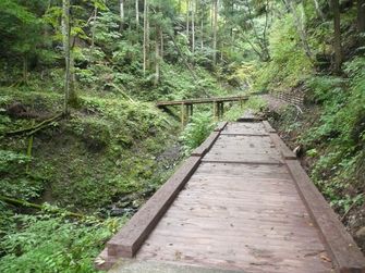 木曽路は谷間の道であるため新しい道路が旧道に重なっているところも多いです。また残っている古道は山の縁(ふち)を歩き細い道が多かったため旅人は不安な思いで歩いたことと思います。熊よけの鐘も設置されていました。