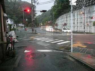 宇治と京都の分かれ道を過ぎ山科(やましな)へと入ります。最後の休憩をした頃から空が怪(あや)しくなってきました。山科駅で行くかやめるか迷いましたが雨覚悟(かくご)で行くことに決断しました。細い道を蹴上(けあげ)に向かいます。案の定、最後の坂で雨が強くなり一時軒先(のきさき)で雨宿りをしました。
