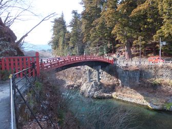 神橋(しんきょう)を渡ります。奈良時代に勝道上人が日光山を開くとき急流にはばまれたそうです。神仏に祈ると2匹の蛇がおくられ蛇は橋となった伝説があります。