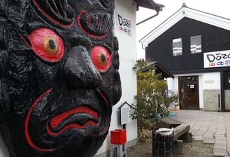 山あいの道を抜けた道の駅のそばに大きな大豆板地蔵尊の仏像がありました。その社は地震で痛んだためか補修がされていて近づけませんでした。