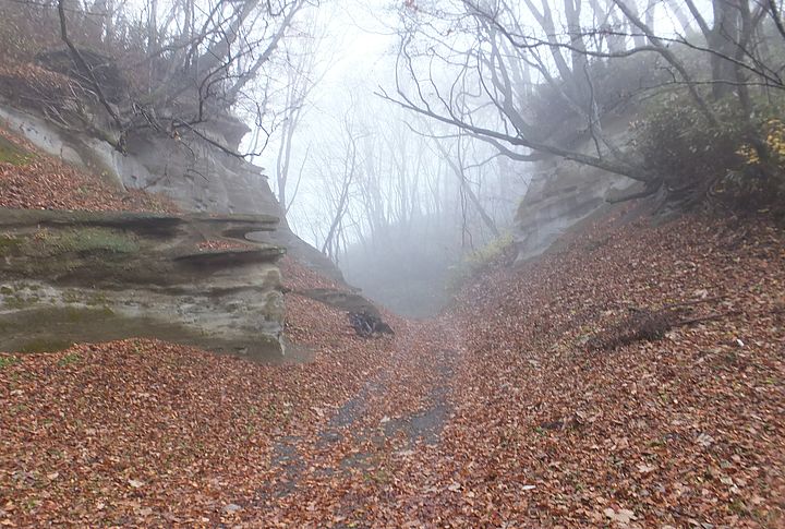 人と会わない霧の中を峠へ向かう