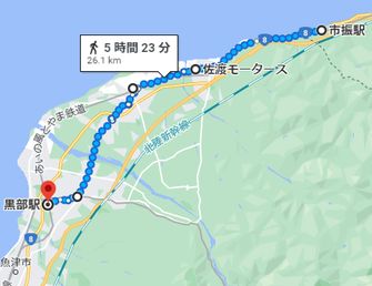 今回は夜行バスに乗りました。値段の安いということもありますが、早朝より歩き始める事が出来るところがとても便利です。新幹線や車で来るとどうしても歩き始めは12時頃になってしまいます。親不知、子不知は歩くのには交通上の危険が伴うためとばしました。地元のお店の人に聞くと子供の頃に遠足で古道を通ったことがあるそうですが、海岸の道は浸食されて現在では通行できないそうです。6時に富山駅に着き始発電車で市振(いちぶり)駅まで来ました。あいにくの雨です。