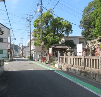 三石神社があり寄ってみます。この神社は孕石(はらみいし)神社とも言われ、一千有余年の昔に神功皇后が懐妊の身でこの神社に立ち寄り大きな岩の上で休息されたそうです。その後境内にある岩や石は皆白い小石を孕(はら)むようになったと伝えられているそうです。子宝の石ですね。