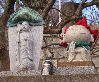 宿場外れの山が近いところに可愛いお地蔵さんが置かれていました。ともに毛糸の帽子がかぶせられていて拝む人の気持ちが感じられました。旅人の無事も祈っていたのですね。
