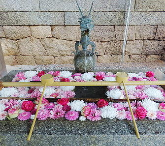 709年頃の起源で毛利元就も戦勝祈願をしたという由緒ある神社です。境内では花手水が美しく神社では初めて見る景色でした。