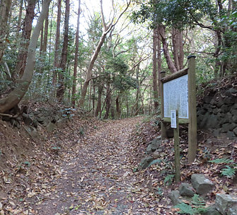 道は地元の方々がよく整備していて歩きやすい道でした。茶臼山に向かってゆっくり登っていきます。この茶臼山の麓(ふもと)あたりに古戦場の案内がありました。毛利家が勢力を拡大している中で大内輝弘が反旗をあげこの地を占領しようとしたところ、毛利家の吉川元春の反撃に遭い敗北した場所でした。暗い森に大内氏の石碑がありました。