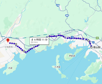 天気予報で3日目に雨の予報が出たため時間を早めて7時に徳山を出発しました。少し長く歩いて3日目の距離を少なくしたいと考えたからです。