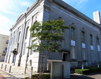 下関市役所裏を回り、さあいよいよ終点が近づいてきました。山口銀行旧本店のいかつい建物の前を通ります。