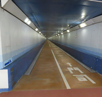 昼食をとって歩いてきた道を戻り、壇ノ浦古戦場付近にある関門トンネル人道入り口のビルに行きました。人道は無料です。多くの観光客が来ていました。エレベーターで降りるとそこがトンネルの始まりでした。これから海の下を歩きます。ドキドキしました。(^_^)